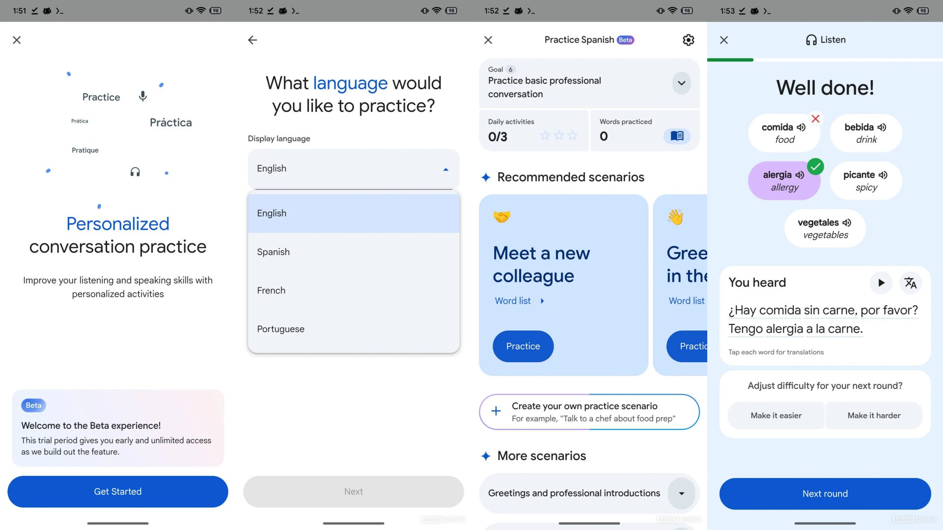 Google Translate pristatė naują funkciją pavadinimu Practice, kuri leidžia mokytis užsienio kalbų žaismingu būdu. Ši funkcija anksčiau buvo tik testavimo stadijoje, tačiau dabar jau veikia plačiau. Iš pradžių Practice buvo pasiekiama tik anglų ir ispanų kalbomis, o šiuo metu papildytos prancūzų ir portugalų kalbomis.