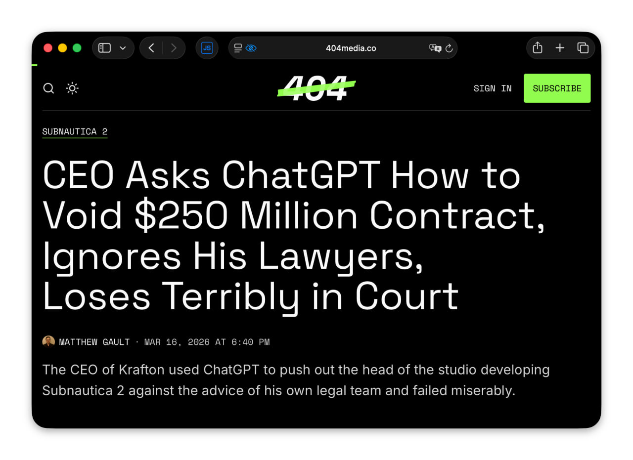 Krafton generalinis direktorius susidūrė su teisiniu iššūkiu po to, kai nusprendė nesumokėti 250 milijonų dolerių premijų žaidimo Subnautica kūrėjams. Šis sprendimas buvo priimtas pasikonsultavus su dirbtinio intelekto įrankiu ChatGPT, kuris patarė perimti kūrėjų studiją.
