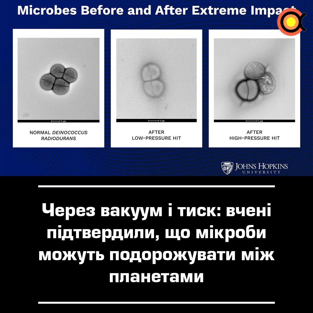 Mokslininkai iš Džonso Hopkinso universiteto atliko eksperimentą, kuris atskleidė, kad mikrobai gali išgyventi ir keliauti kosmose. Tai reiškia, kad jie gali pernešti gyvybės formas tarp planetų, išlaikydami savo gyvybingumą.