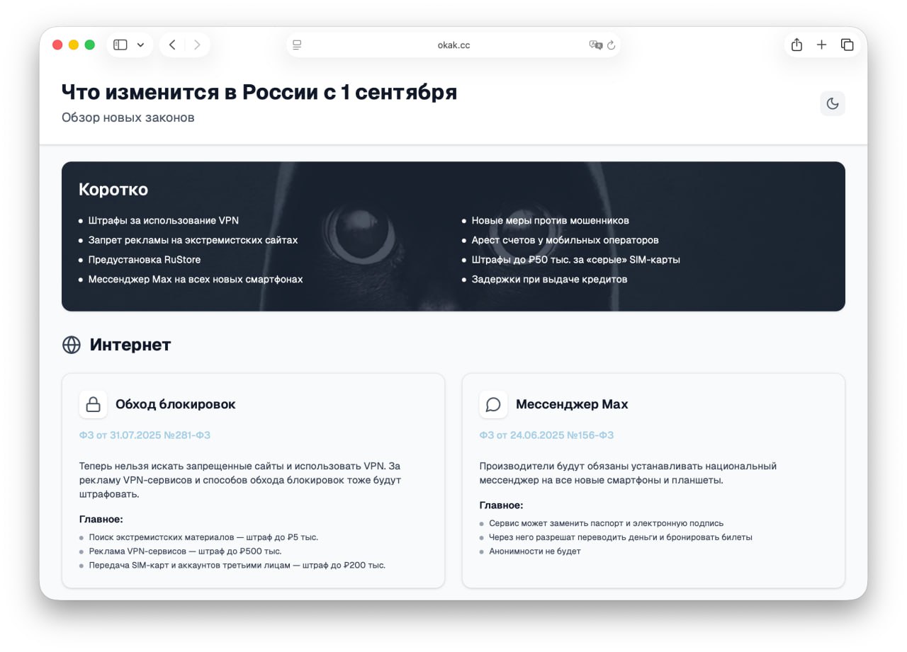 Rugsėjo 1 dieną Rusijoje įsigaliojo nauji įstatymai, kurie turės didelę įtaką kasdieniam gyvenimui. Šie pokyčiai liečia interneto naudojimą ir technologijų taikymą. Nuo šiol VPN paslaugos bus draudžiamos, o jų paieškos internete bus ribojamos. Be to, kiekviename išmaniajame telefone bus privalomai įdiegiama Max programa kaip numatytoji.