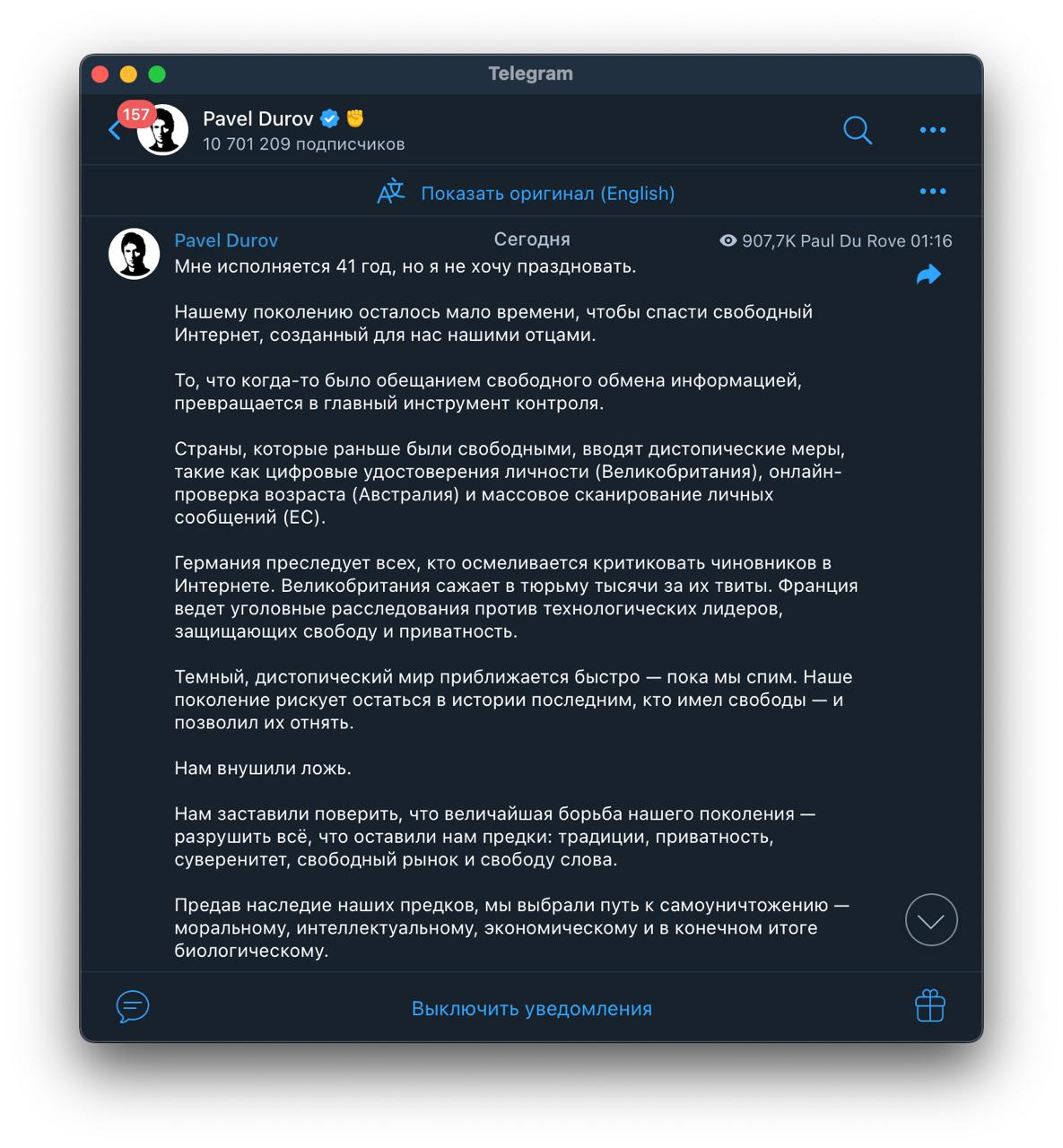 Pasak Durovo, laisvas internetas yra gyvybiškai svarbus mūsų visuomenei, tačiau jis susiduria su rimtais pavojais. Durovas įspėja, kad artėja tamsus ir distopinis pasaulis, kuriame laisvė gali būti apribota, jei nesiimsime veiksmų. Jo teigimu, mes galime būti paskutinė karta, kuri žinojo, kas yra tikra laisvė internete, jei nebus imtasi reikiamų priemonių ją apsaugoti.