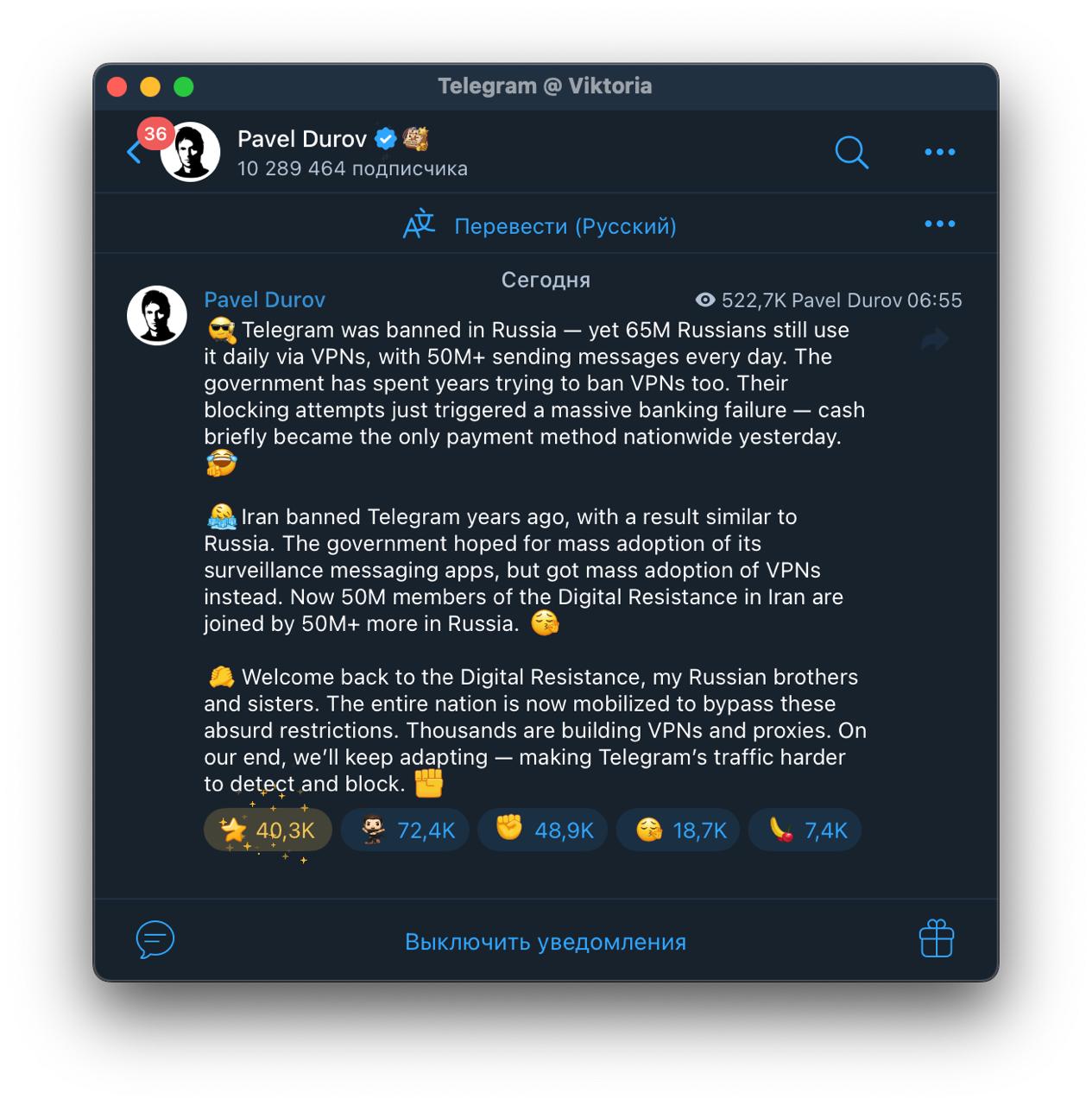 Nors Rusijos valdžia siekia apriboti Telegram naudojimą, platforma vis dar yra populiari tarp rusų. Šiuo metu ja naudojasi apie 65 milijonai žmonių šalyje, nepaisant draudimų. Durovas teigia, kad šios iniciatyvos tikslas – sutelkti tautos pastangas apeiti šiuos apribojimus.