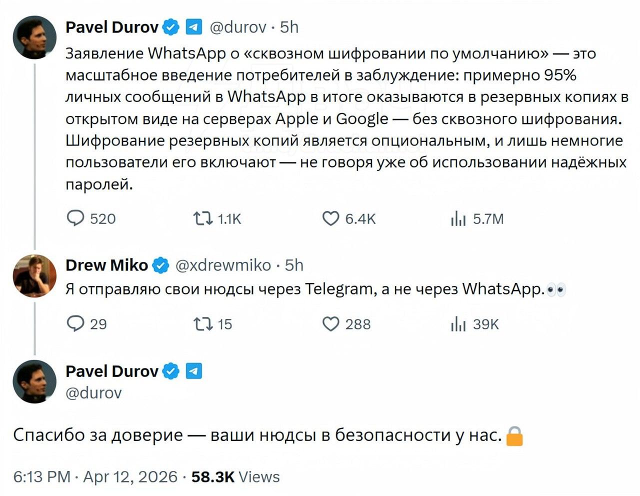 Telegram įkūrėjas Pavelas Durovas rekomenduoja naudoti šią platformą asmeninėms nuotraukoms siųsti. Jo teigimu, Telegram užtikrina aukštą saugumo lygį, kuris yra patikimesnis nei WhatsApp.